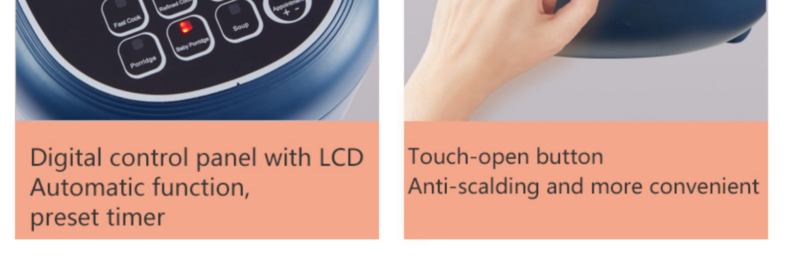 Function: Non-Stick Coating Inner Pot,cake,Leben,TIMING,Claypot Cooked Food,Reservation,Rice Cooking,Non-water Non-oil Fricassee & Lobscouse,Rice Cooking & Porridge Cooking & Soup Stewing,Cooking & Stewing & Heating,Coarse Cereals,Porridge/Soup,Quick Boiling,Stewing,Reheating,Fine Cook,Heat Preservation,Brown Steamed Rice,Brown Rice Germination,Baby Porridge